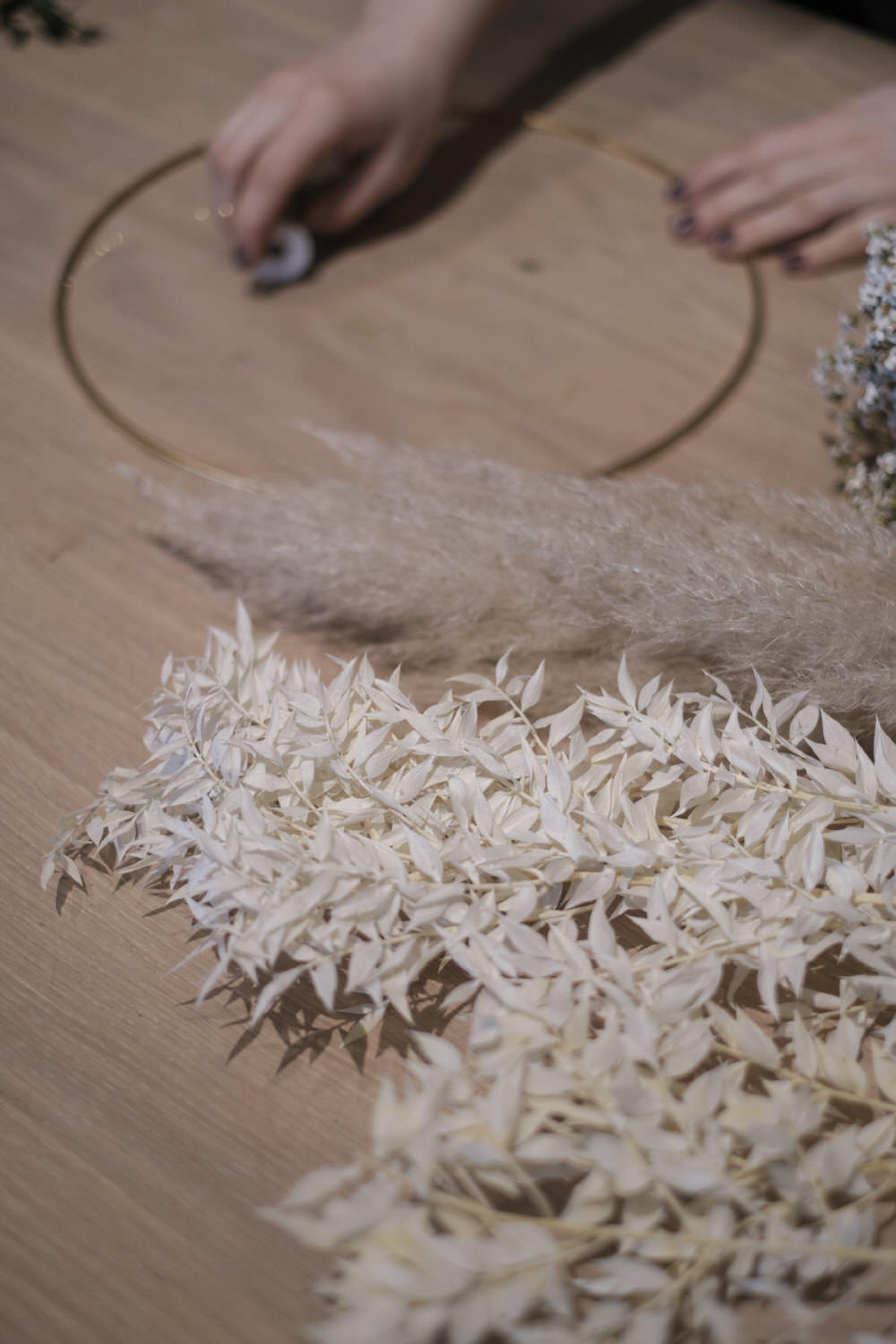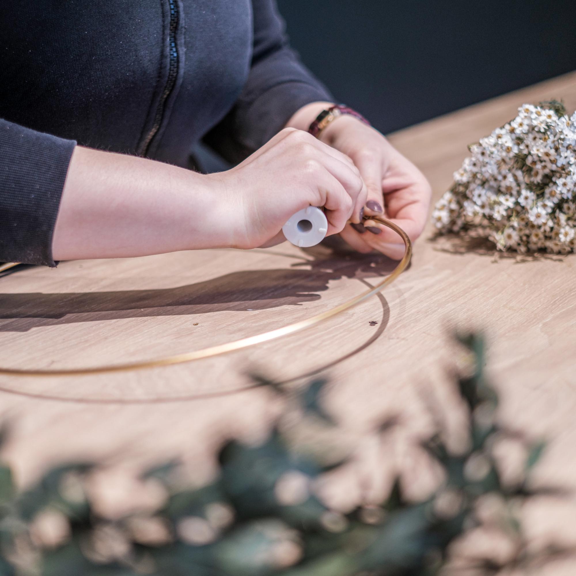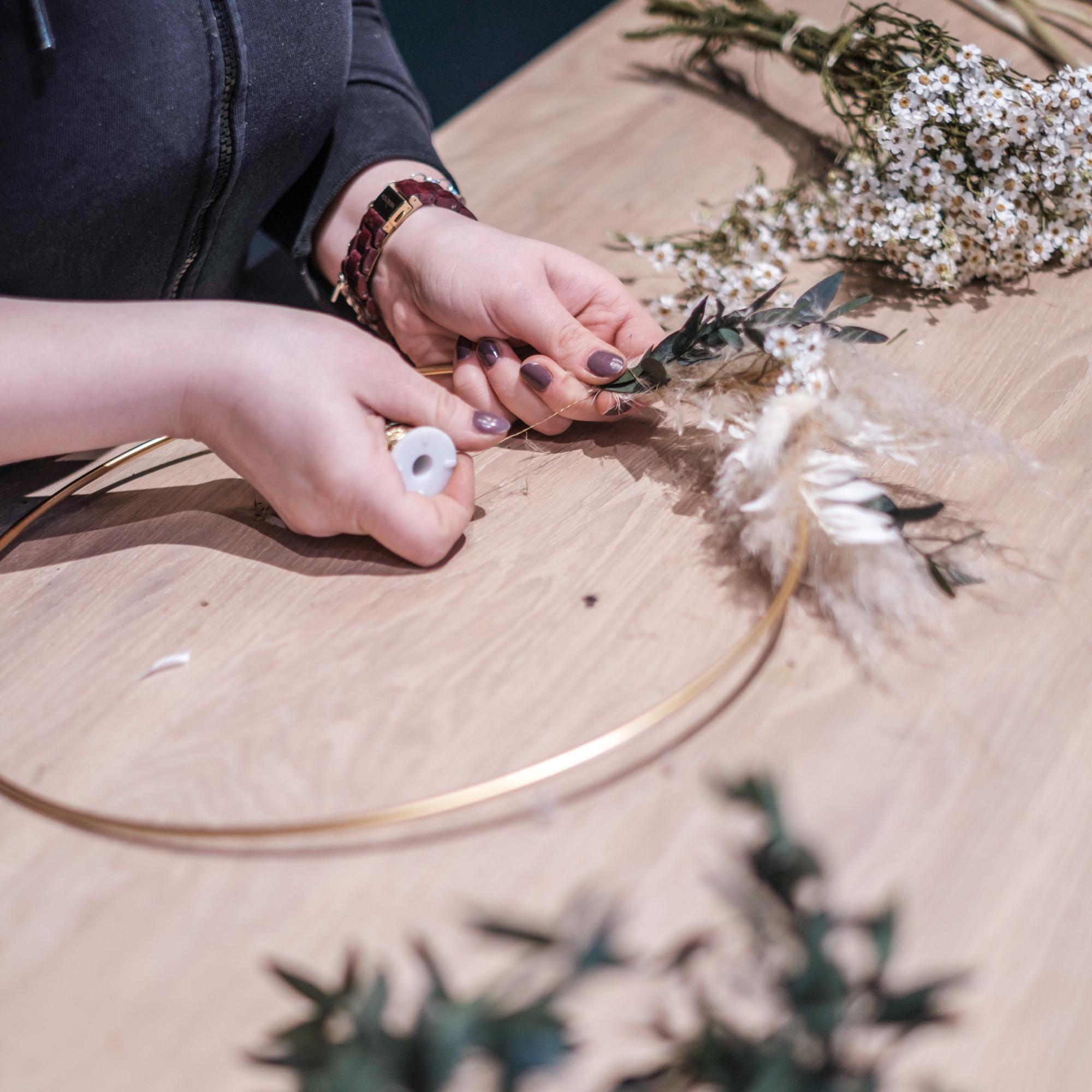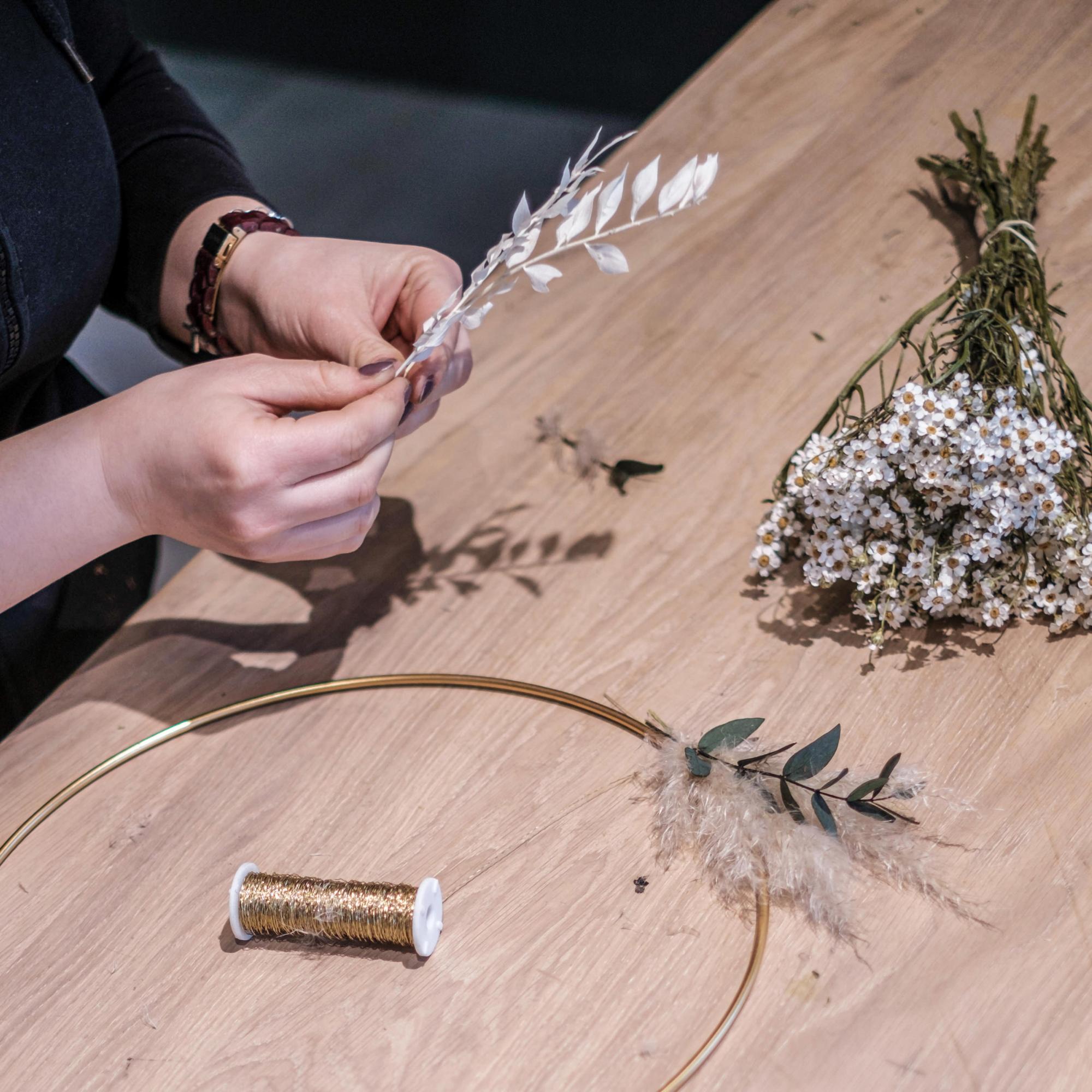 Hast du dich für deine Lieblingspflanzen und eine Farbkombination entschieden, schneide dir im ersten Schritt deine Blüten und Blätter so zurecht, dass du sie zu kleinen Mini-Sträußen formen und einfach am Ring festmachen kannst. Binde die Trockenblumen von links und rechts, sodass sie sich in der Mitte treffen, und befestige sie mit dem Draht.