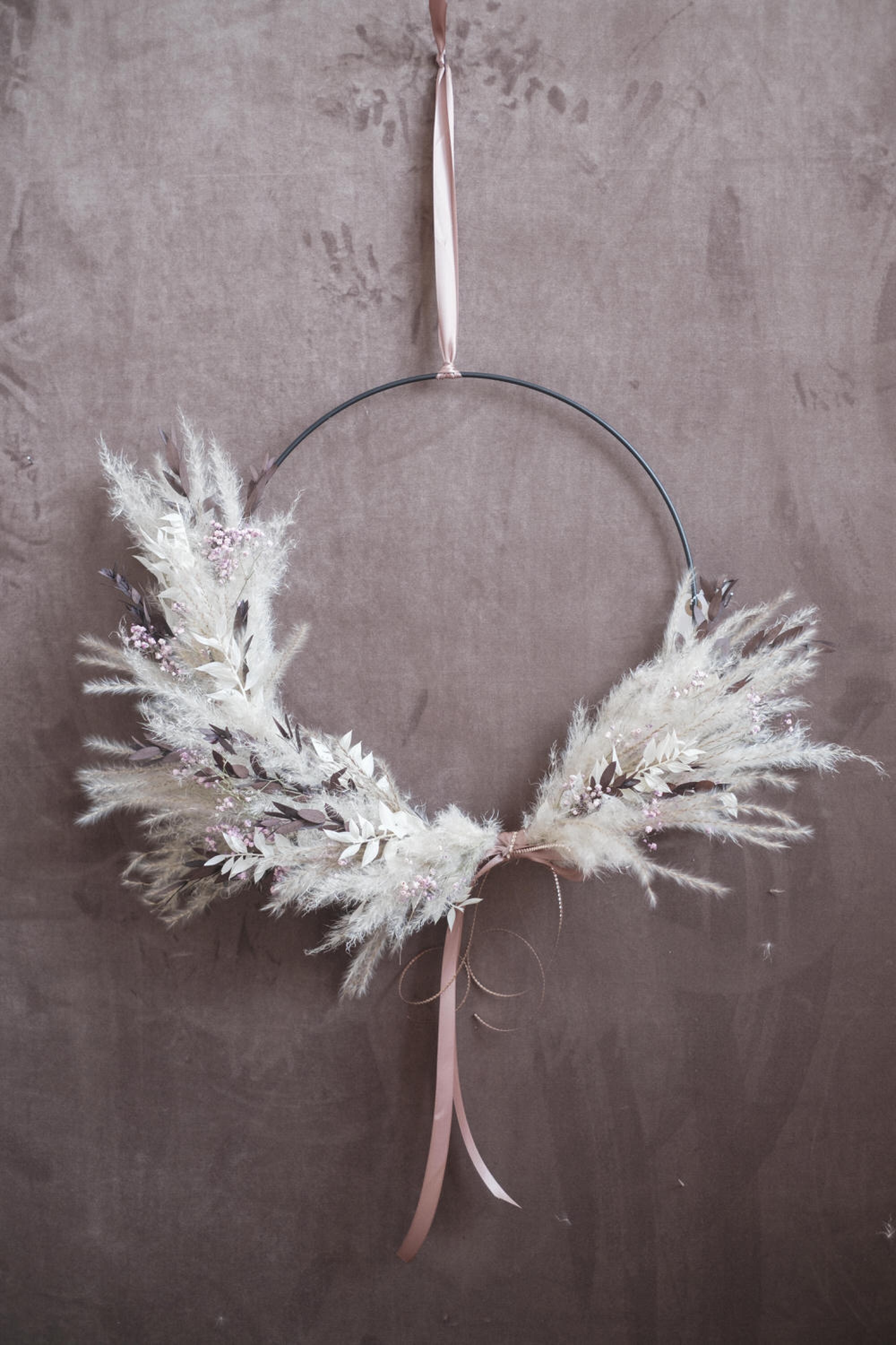 Wickle den Draht mehrmals um den Ring, damit die Pflanzen auch sicher festsitzen. Setze immer die nächste Schicht Trockenblumen so an, dass die Stiele der vorherigen Schicht nicht mehr zu sehen sind. Draht- oder Stiellücken lassen sich am Ende mit einzelnen Blüten oder Blättern gut kaschieren. Entscheide selbst, ob du deinen Ring vollständig mit Trockenblumen bedeckst oder nur bis zur Hälfte bindest. Einen schönen Abschluss erzielst du beispielsweise mit einem schönen Naturband nach Wahl. Jetzt benötigst du nur mehr ein Band oder eine Kordel, um den Ring an der Wand, im Raum oder im Fenster zu befestigen.
