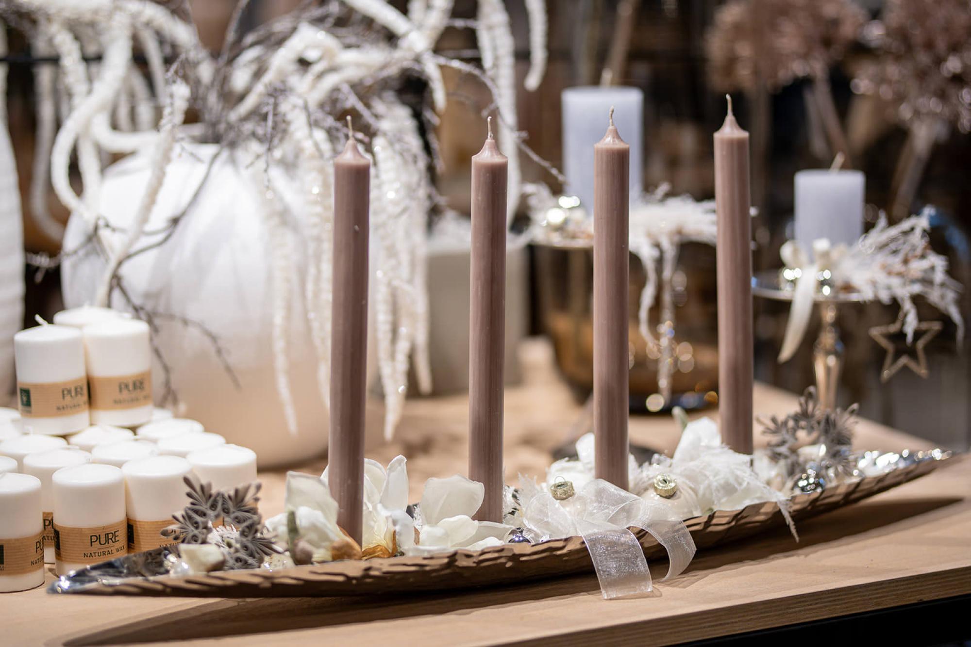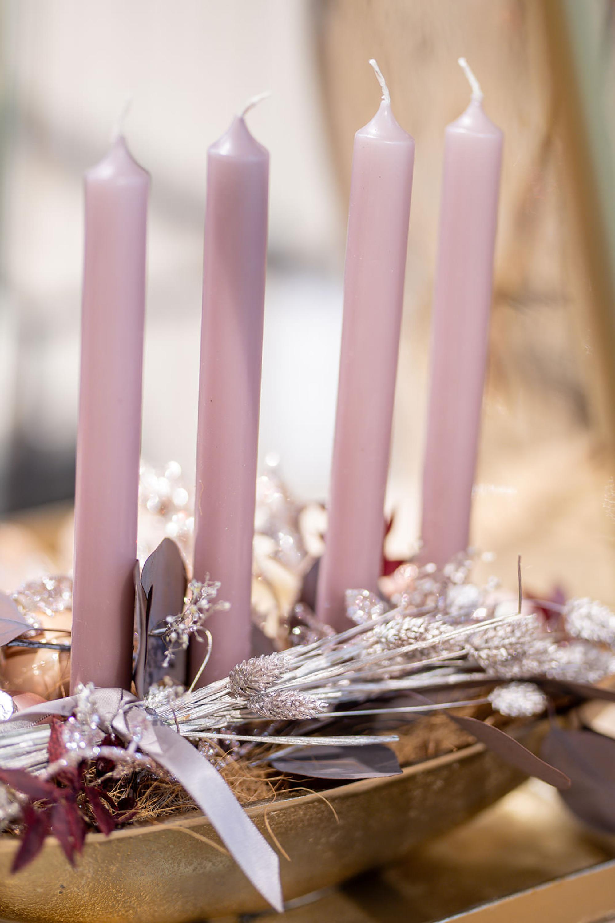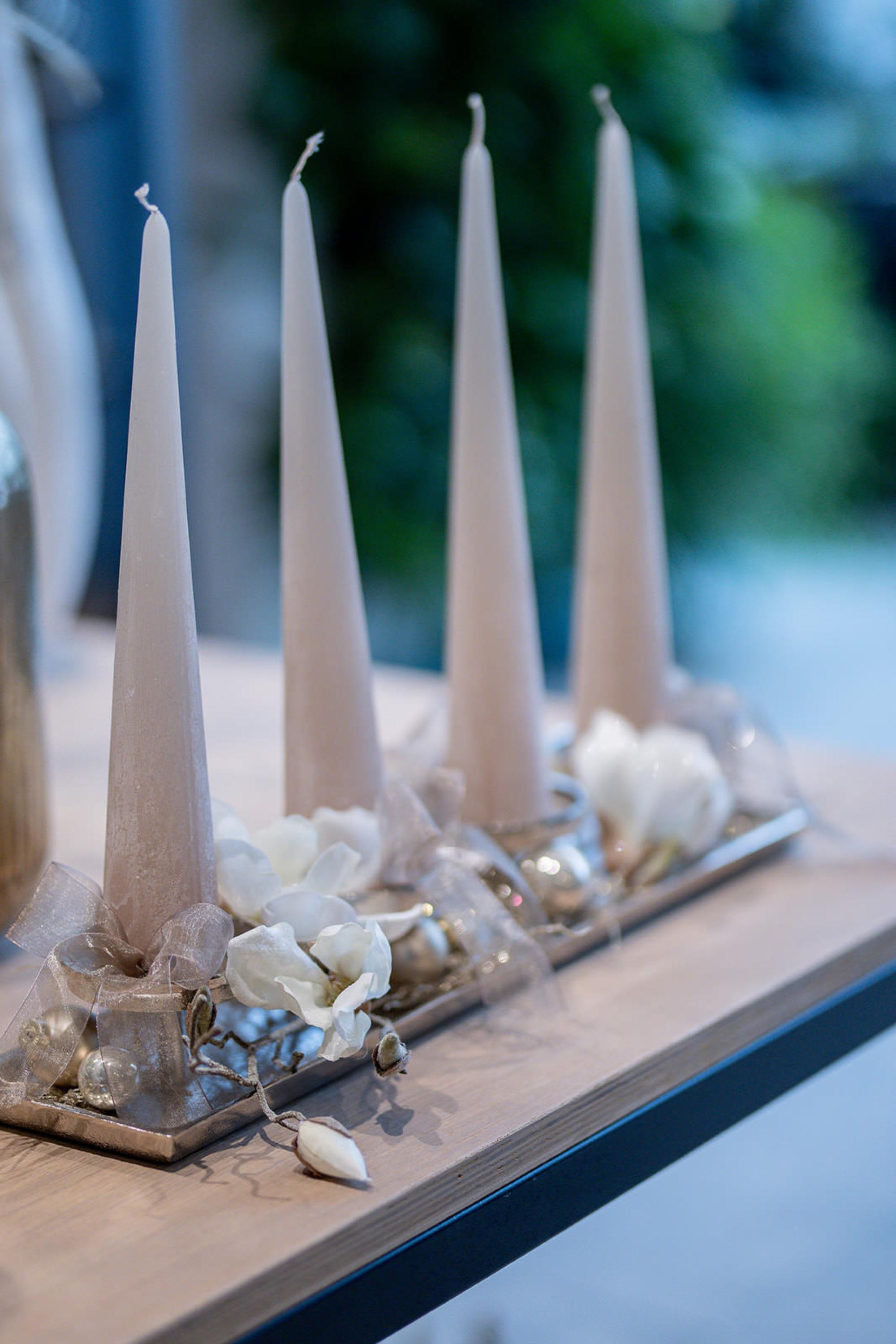 Erhellend schöne Winterträume zaubern wir heuer für Sie in sanften Farben mit einem Hauch Pastell. Die schimmernden Reflexionen in glänzenden Oberflächen, Kugeln oder Sternen und die pudrig leichte Eleganz von Kerzen in Sandtönen oder Champagner, wissen den Winter in seiner feinsten Form zu interpretieren. Getrocknete und gebleichte Naturmaterialien und grausilbrige Flechten schaffen frostig, edle Akzente auf Adventkränzen und adventlichen Gestecken.