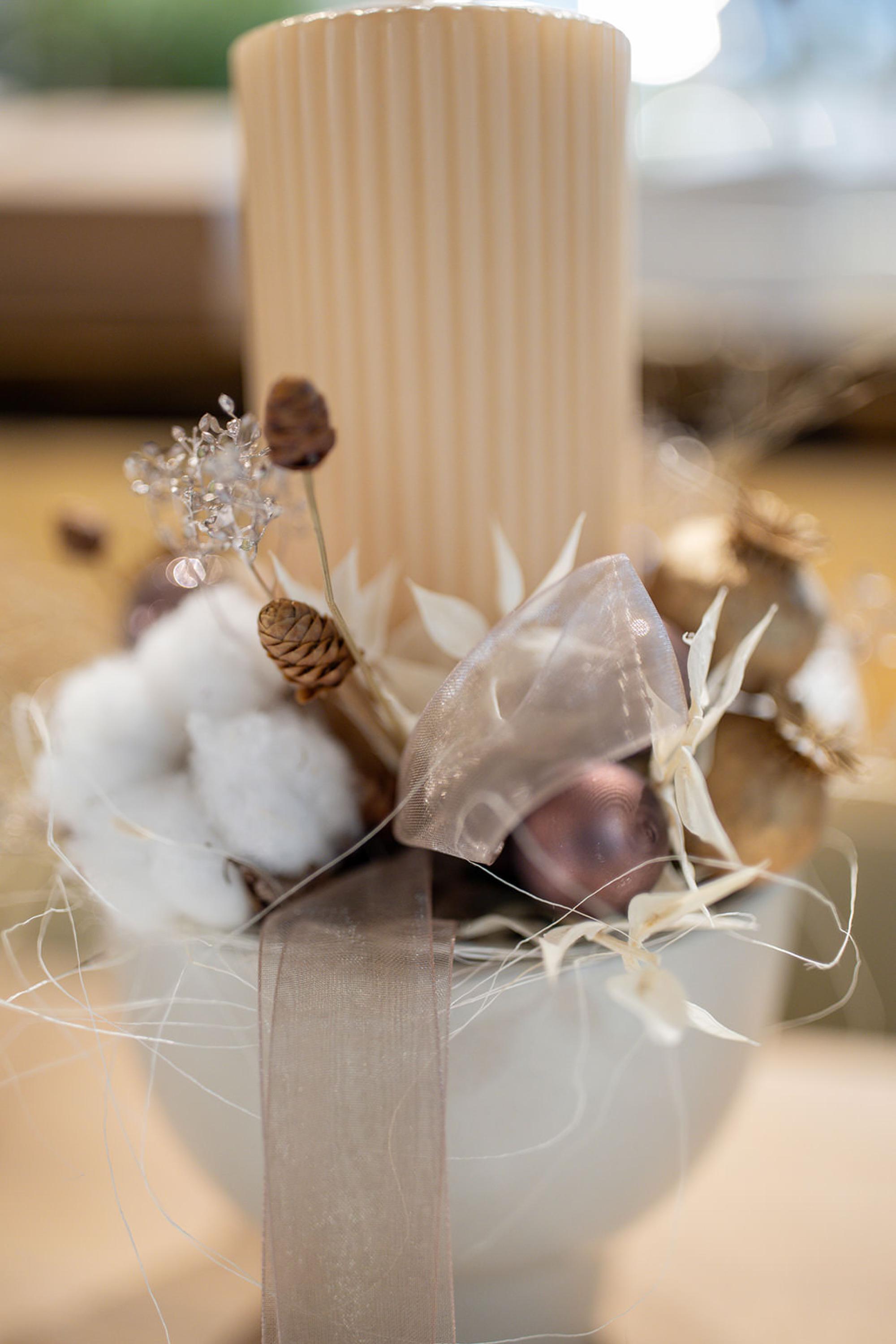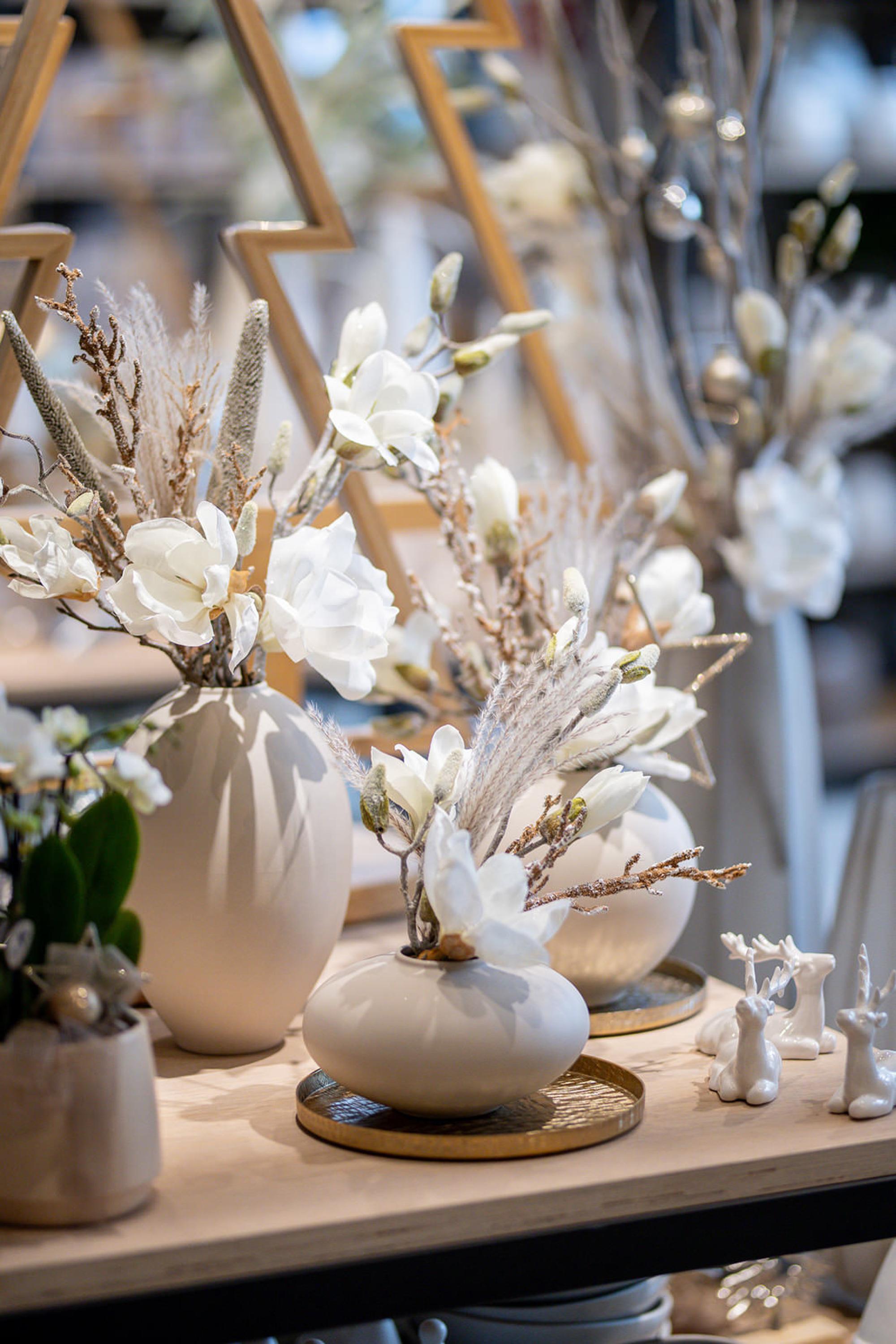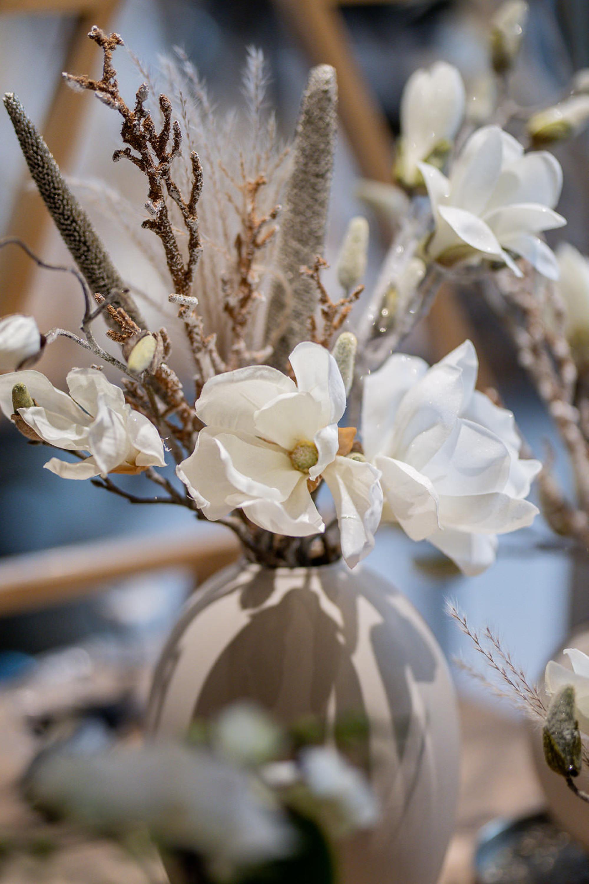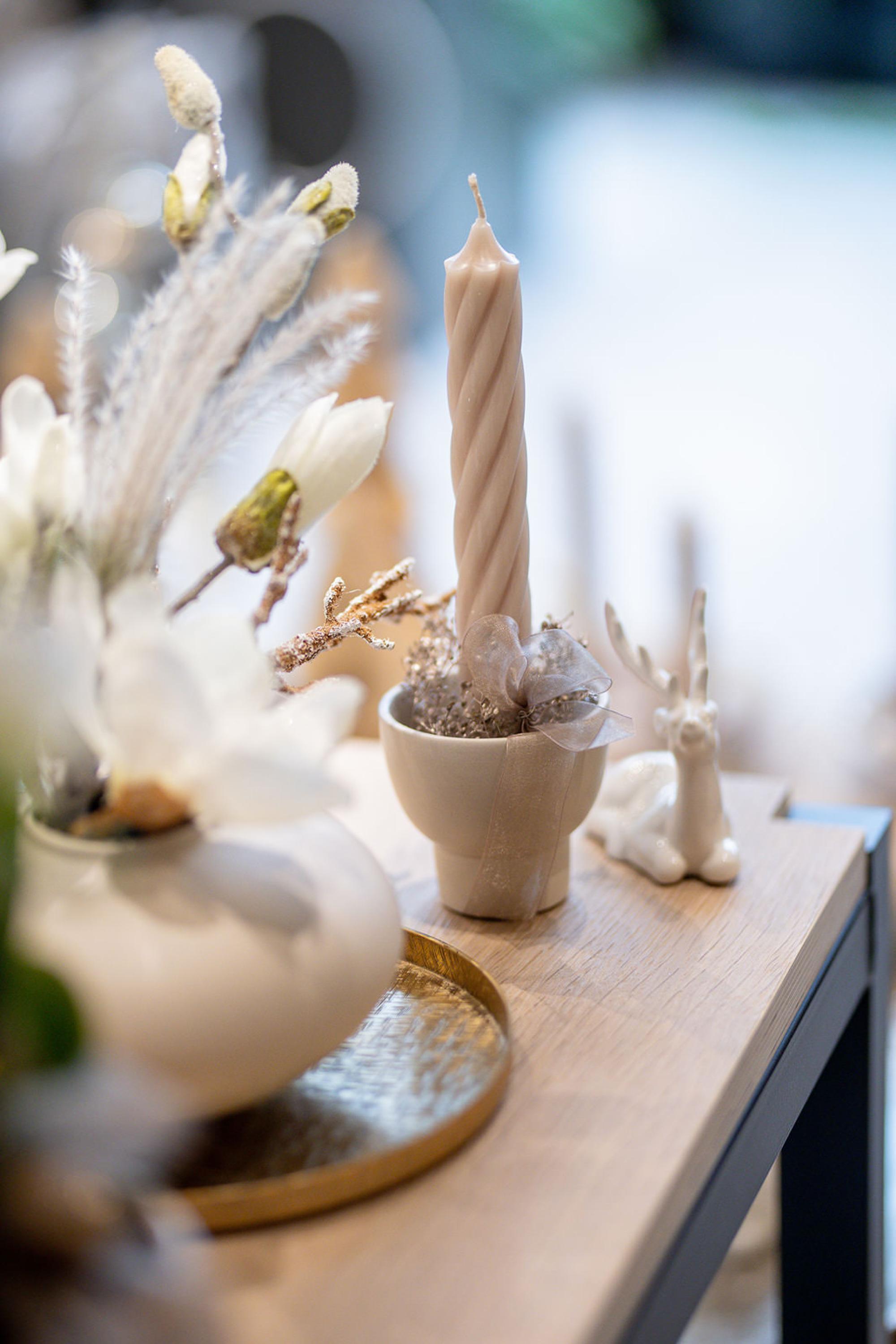 Erhellend schöne Winterträume zaubern wir heuer für Sie in sanften Farben mit einem Hauch Pastell. Die schimmernden Reflexionen in glänzenden Oberflächen, Kugeln oder Sternen und die pudrig leichte Eleganz von Kerzen in Sandtönen oder Champagner, wissen den Winter in seiner feinsten Form zu interpretieren. Getrocknete und gebleichte Naturmaterialien und grausilbrige Flechten schaffen frostig, edle Akzente auf Adventkränzen und adventlichen Gestecken.