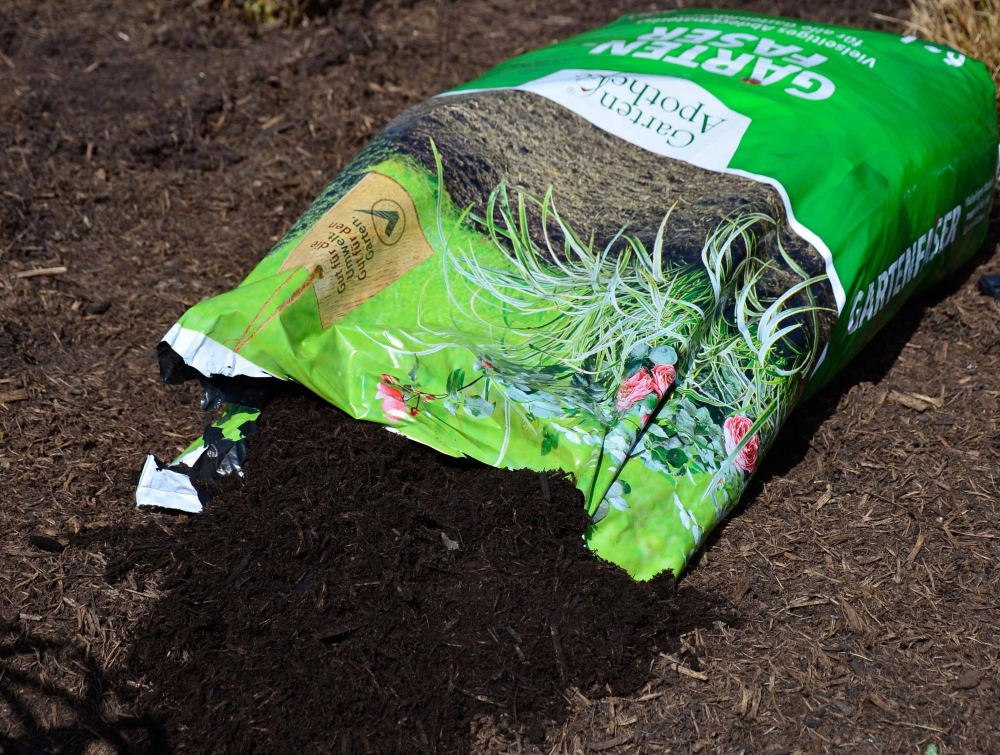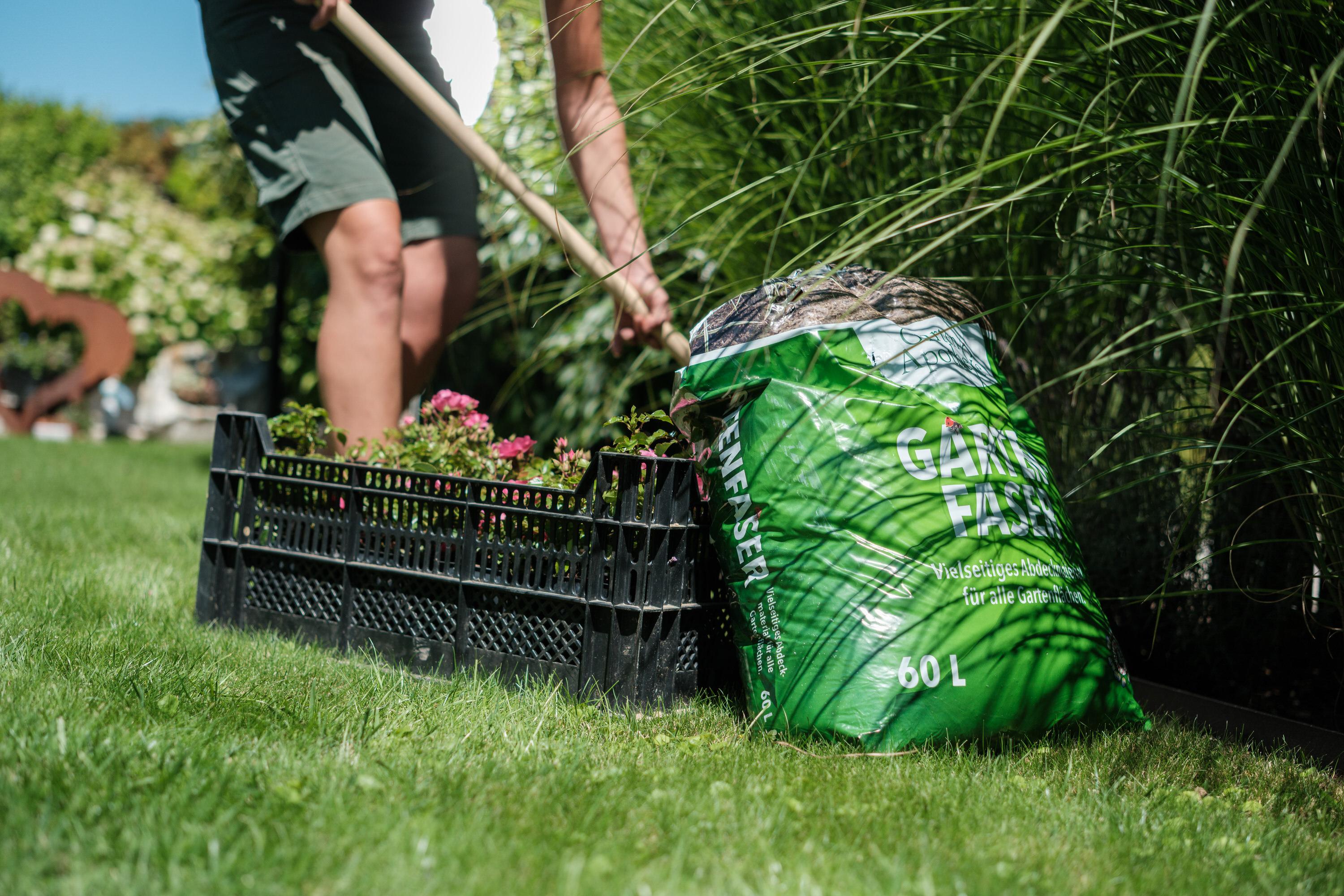 Schritt 6: Um Unkraut zu minimieren und die Wasserspeicherung zu forcieren, bringen Sie zum Schluss noch eine Mulchschicht auf. Wir empfehlen unsere GARTENFASER aus der Langeder Gartenapotheke.