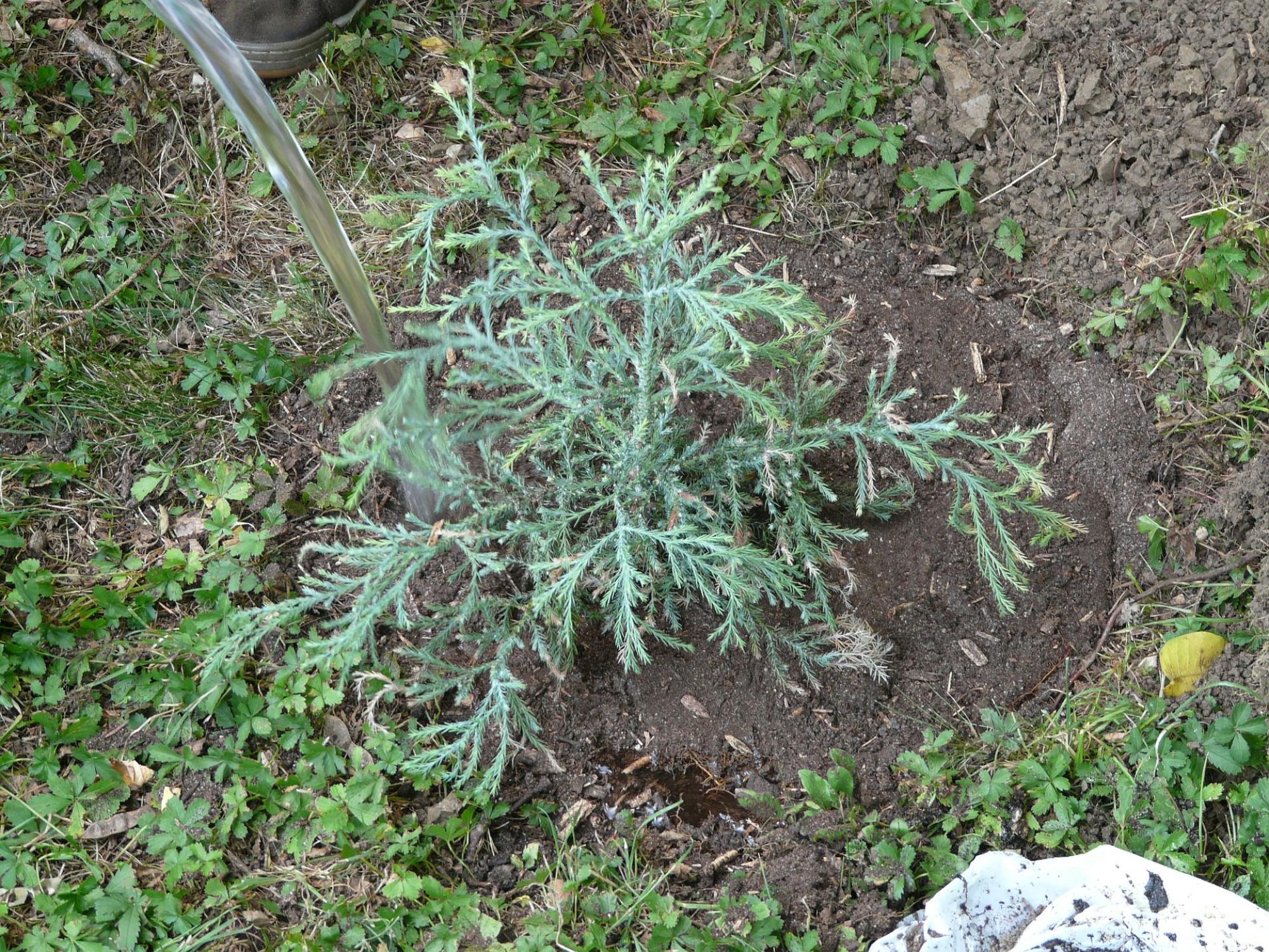Obstbäume: Die Veredelungstelle - eine verdickte Wölbung am unteren Stammende - sollte mindestens zehn Zentimeter oberhalb der Bodenoberfläche liegen.Schritt 5: Füllen Sie nun das Pflanzloch mit dem Erde-Substrat-Gemisch und drücken Sie die Erde gut an. Formen Sie einen Gießrand um die Pflanze herum und gießen Sie den Pflanzbereich gut an, um etwaige Lücken zwischen Ballen und Erde zu schließen. Das Gießen je nach Witterung ist in den ersten Wochen bis hin zu einem Jahr nach der Pflanzung entscheidend. Vor allem immergrüne Pflanzen benötigen auch im Winter ausreichend Feuchtigkeit.