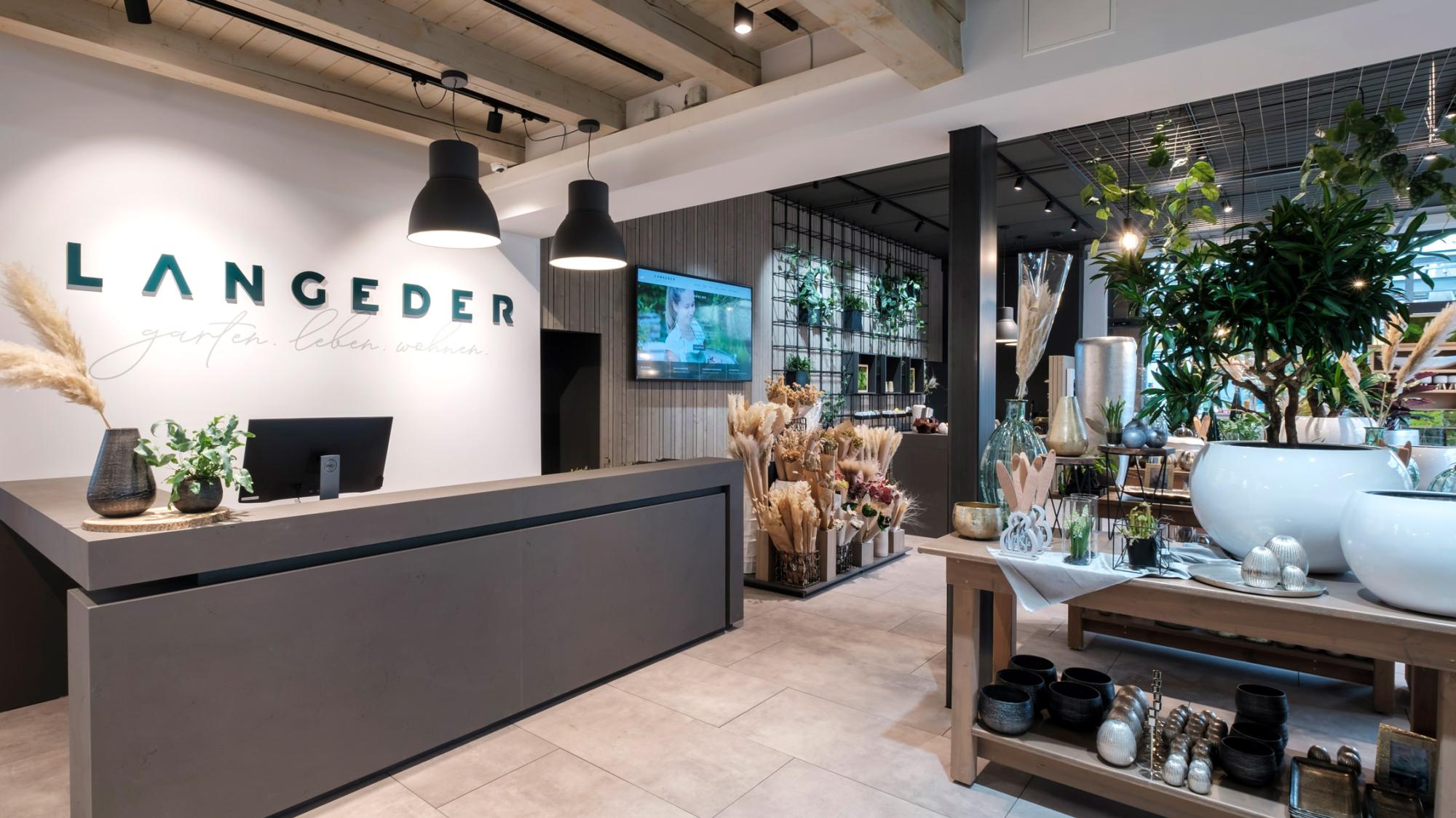 Geschenke-Ecke: Hier finden Sie jederzeit stilvolle, saisonal abgestimmte und fertig arrangierte Geschenkideen für jeden Anlass. Das moderne Selbstbedienungskonzept ermöglicht ein Shoppingerlebnis auch außerhalb der regulären Langeder-Geschäftszeiten.