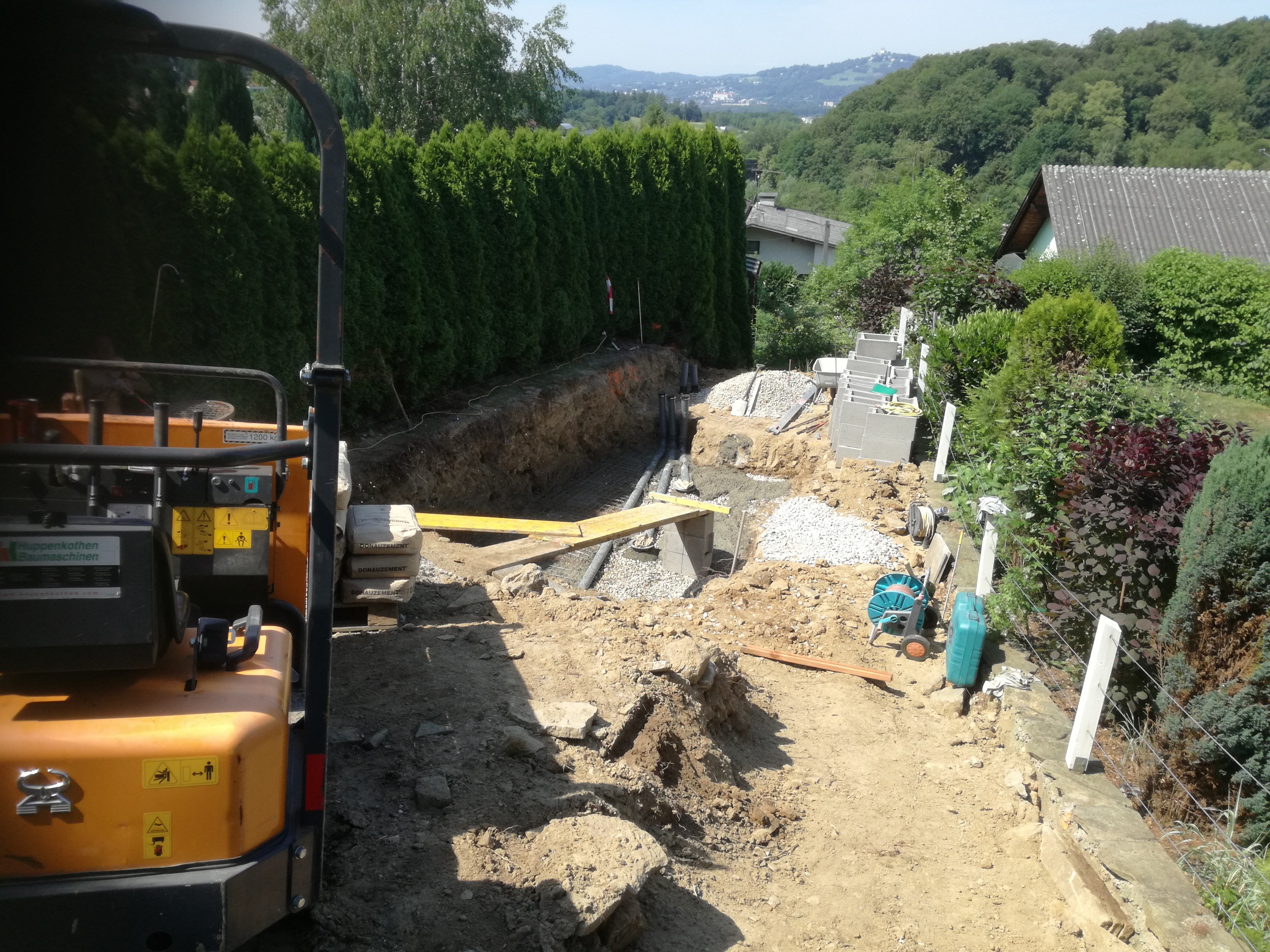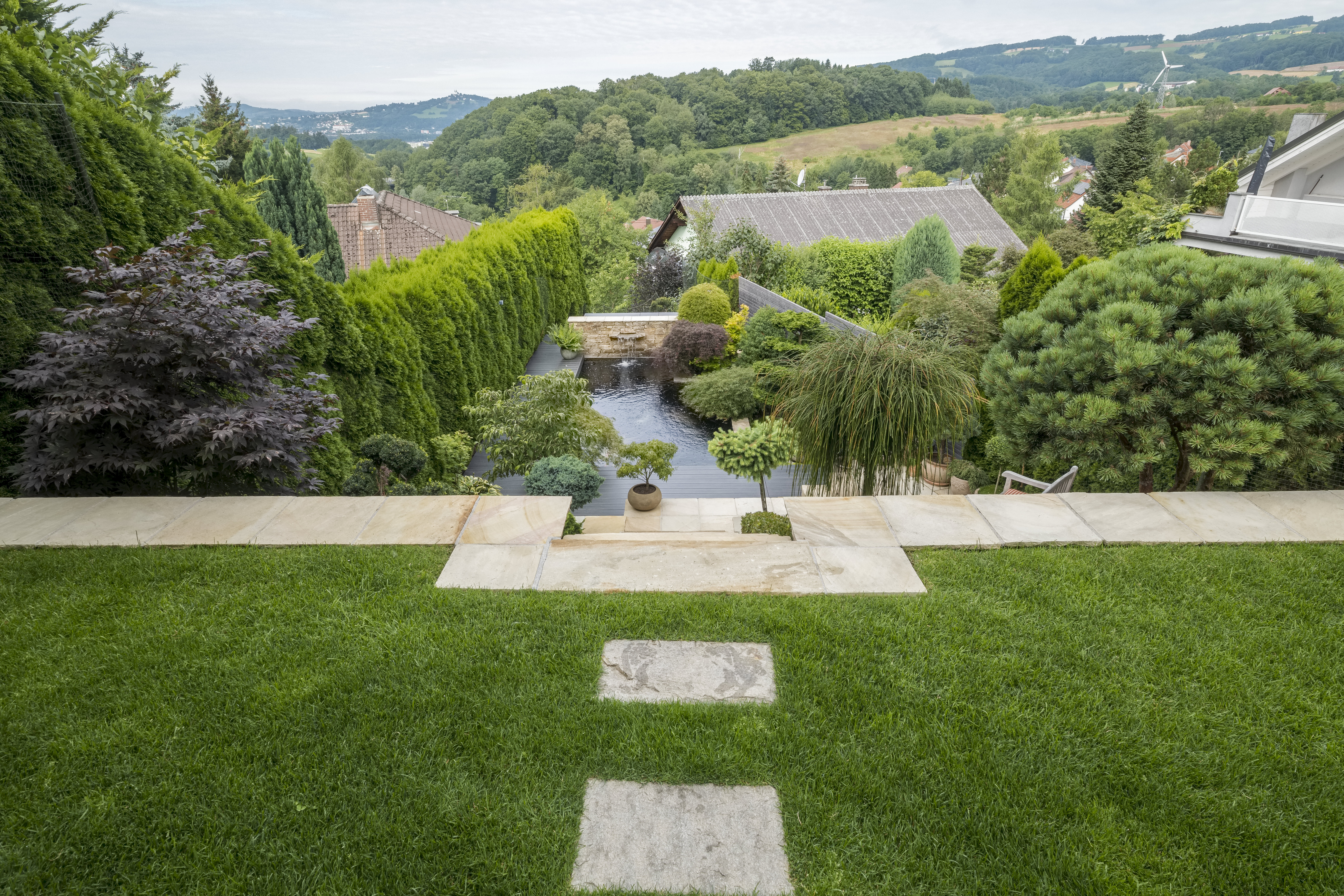 Manchmal braucht es Mut, um ein steiles Grundstück in einen echten Gartentraum zu verwandeln. Bei Familie Seimair war das Ziel klar: Aus dem stark abfallenden Gelände mit kleinem Teich sollte ein harmonischer, sicher begehbarer und pflegeleichter Garten entstehen – mit einem großzügigen Koiteich in Beckenbauweise und hochwertiger Filtertechnik. Um diesen Traum zu verwirklichen, planten und errichteten wir eine stabile Stufenanlage, gestalteten die steile Böschung naturnah und erweiterten die Rasenfläche vor dem Wintergarten. Ein geschützter Ruheplatz direkt am Wasser rundet das neue Gartenerlebnis ab und ermöglicht einen wunderschönen Weitblick ins Grüne.