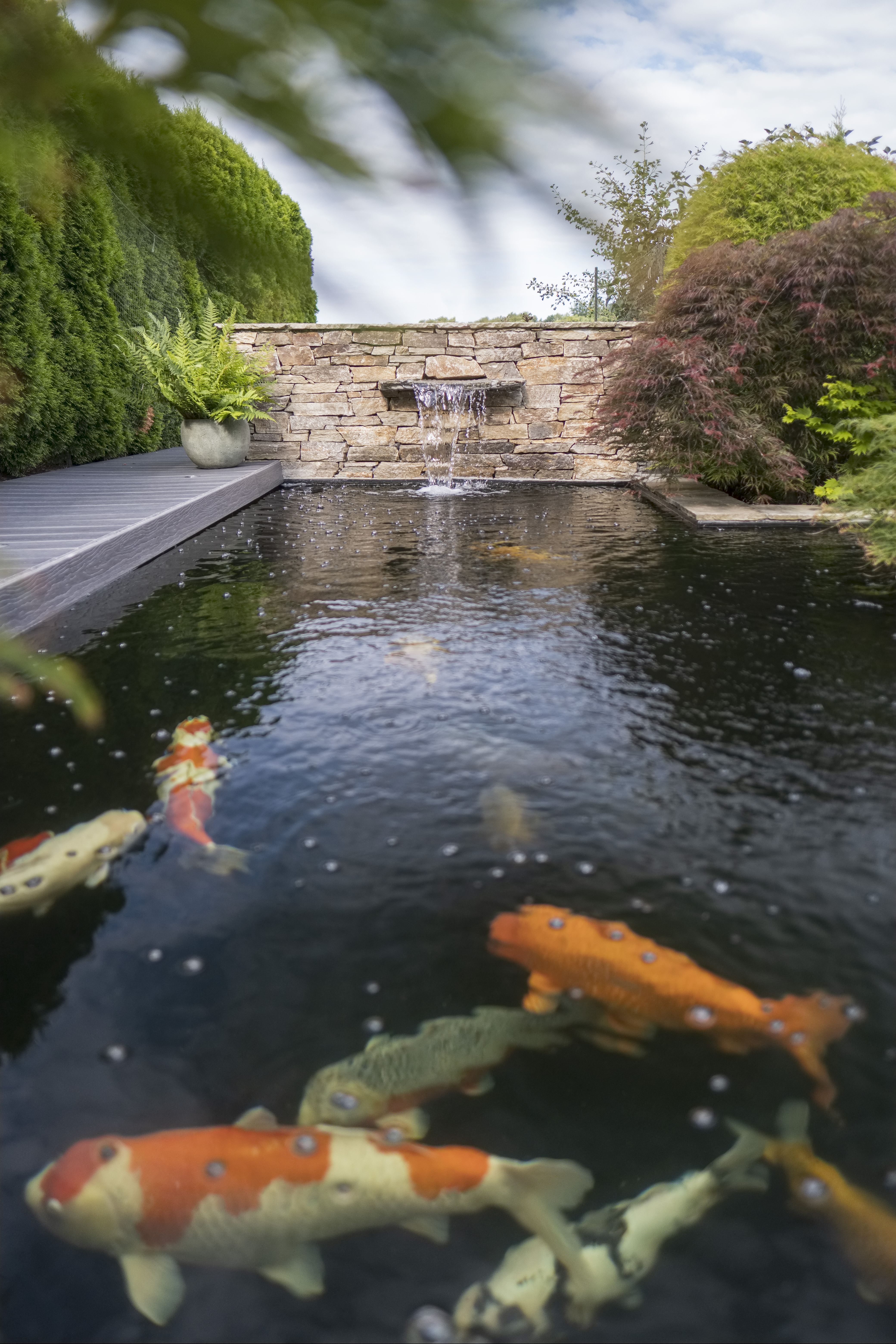 Ein kleiner Wasserfall aus Gneisstein verleiht dem Koiteich Bewegung, Ruhe und natürlichen Charme.