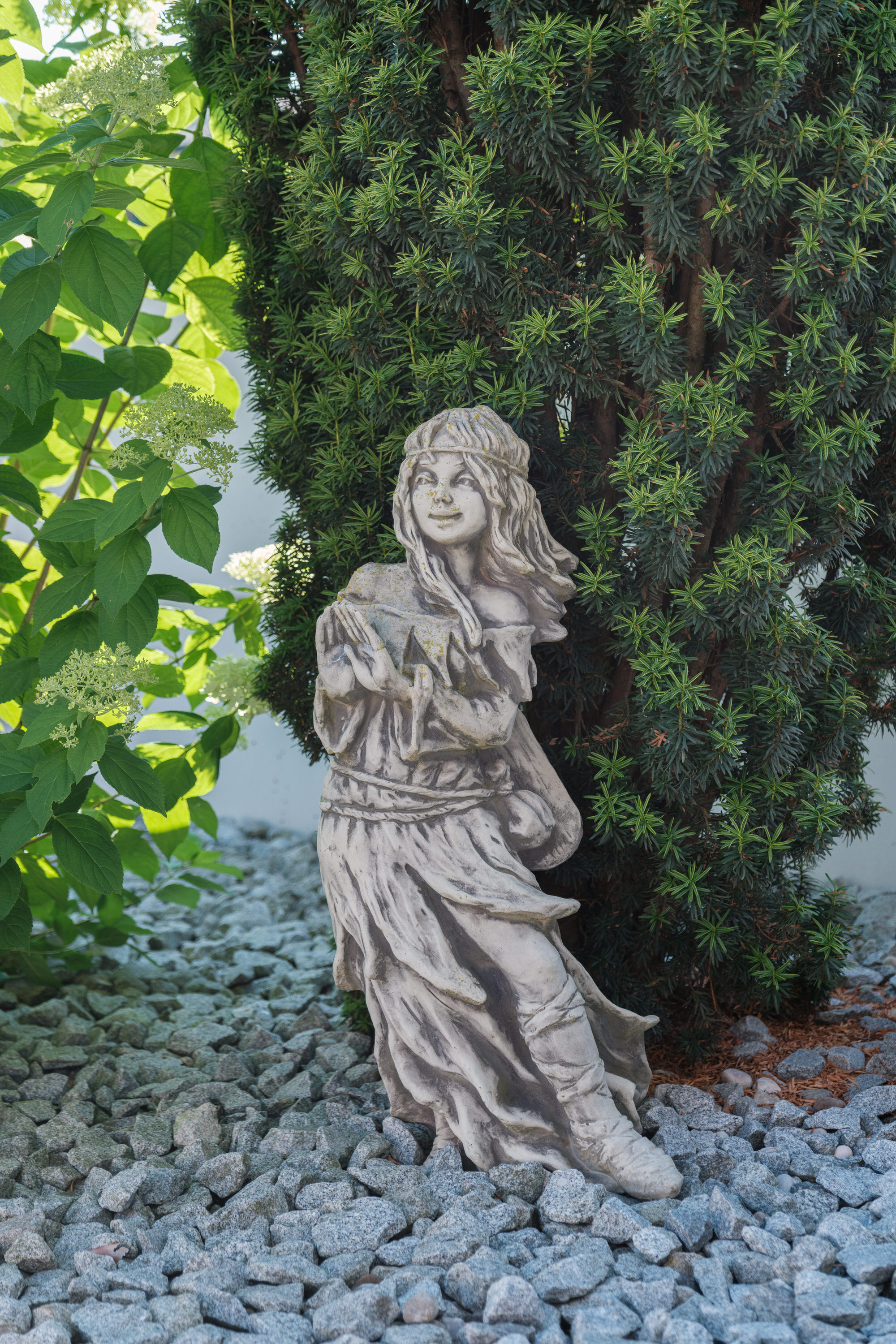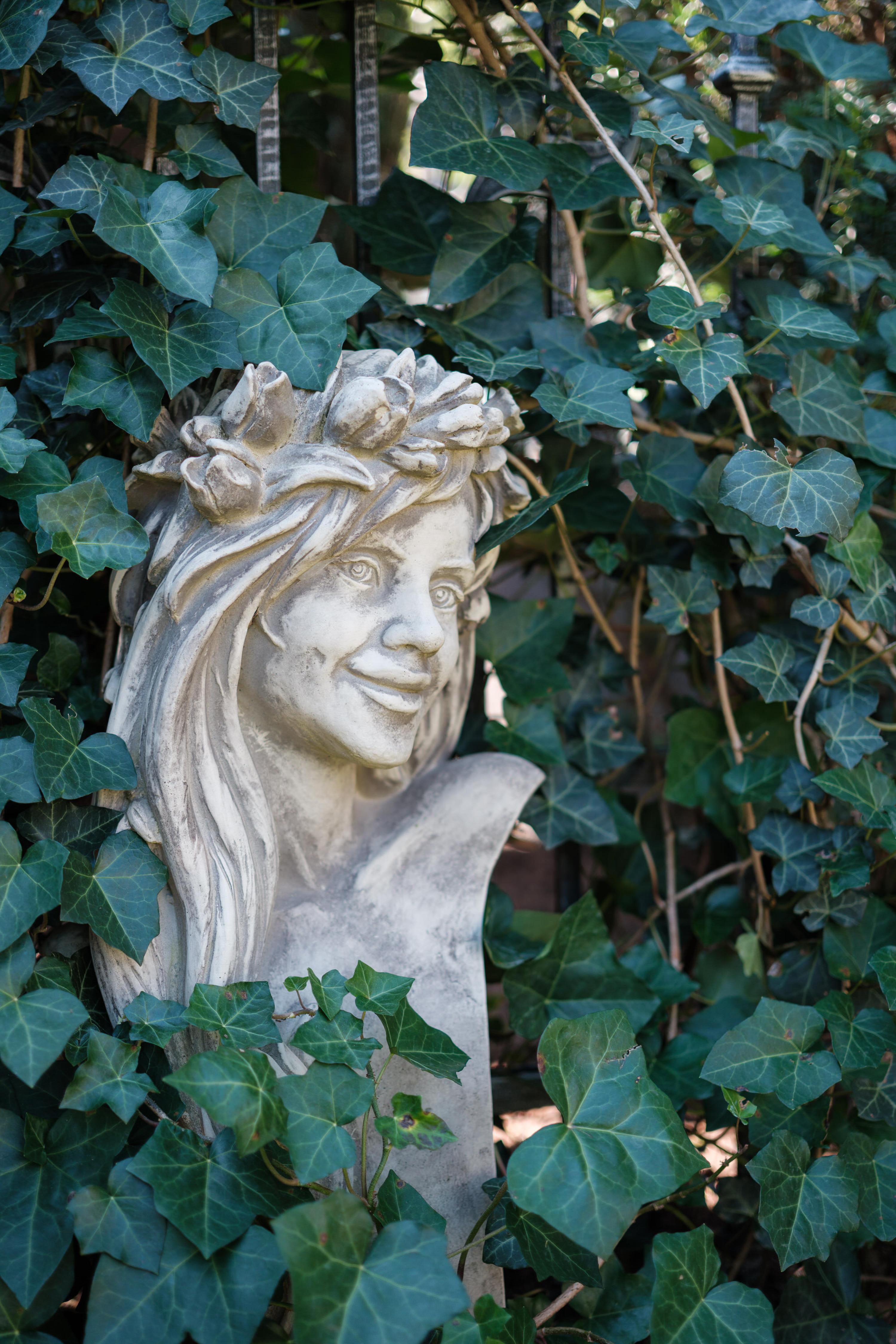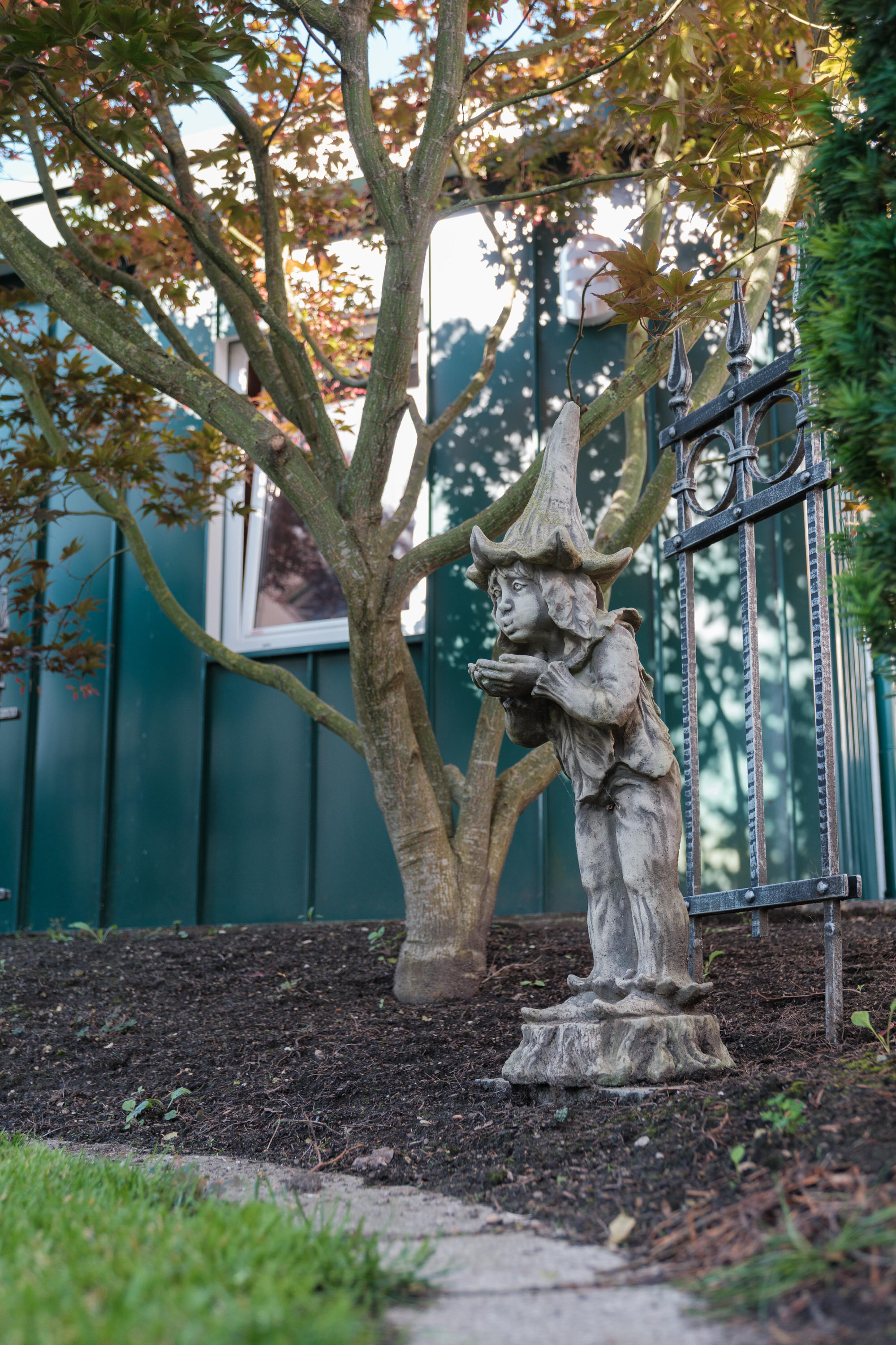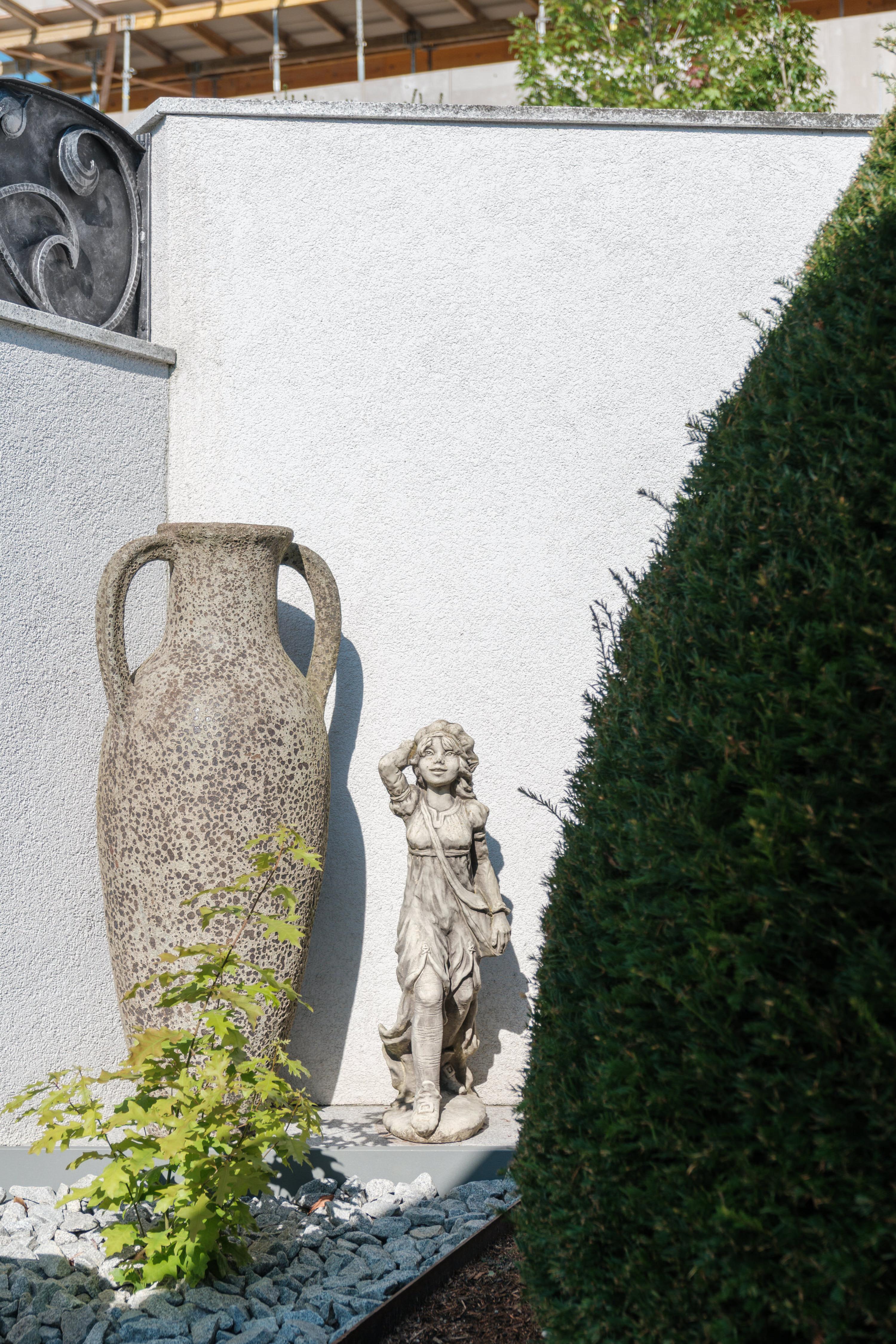 Mit Bedacht platzierte Steinfiguren ergänzen das Bild – sie wirken als Blickfang und verleihen dem Garten eine künstlerische Note.