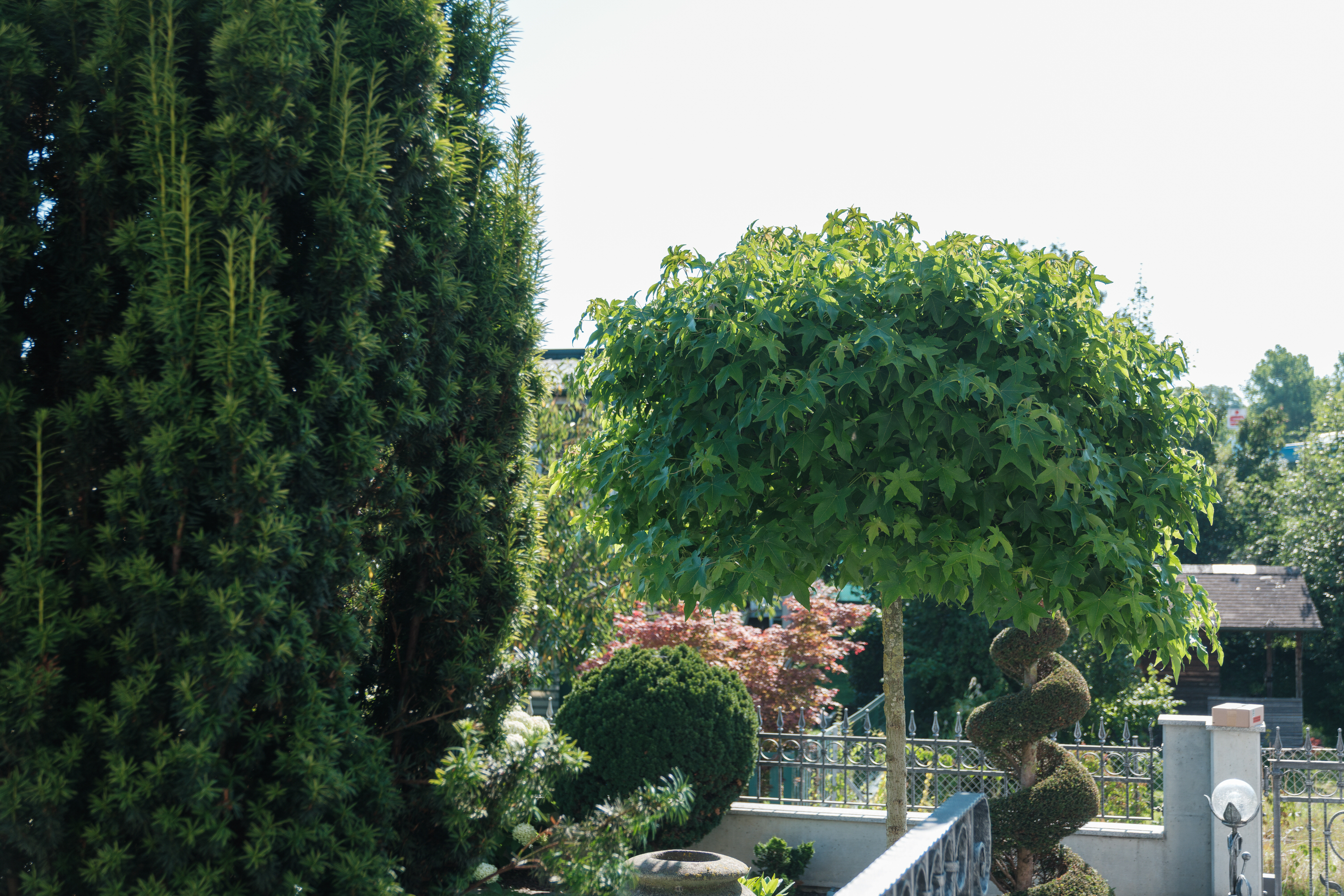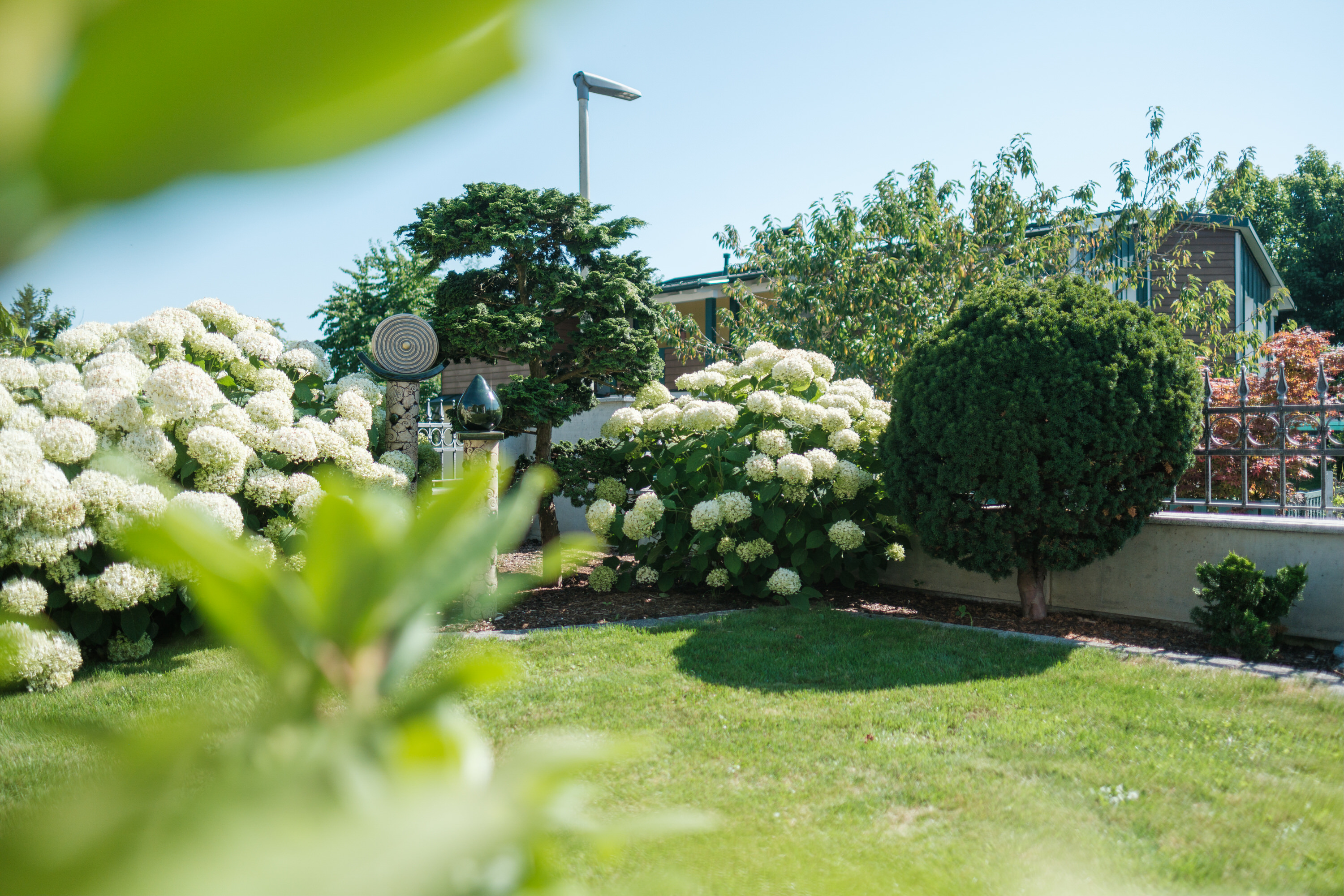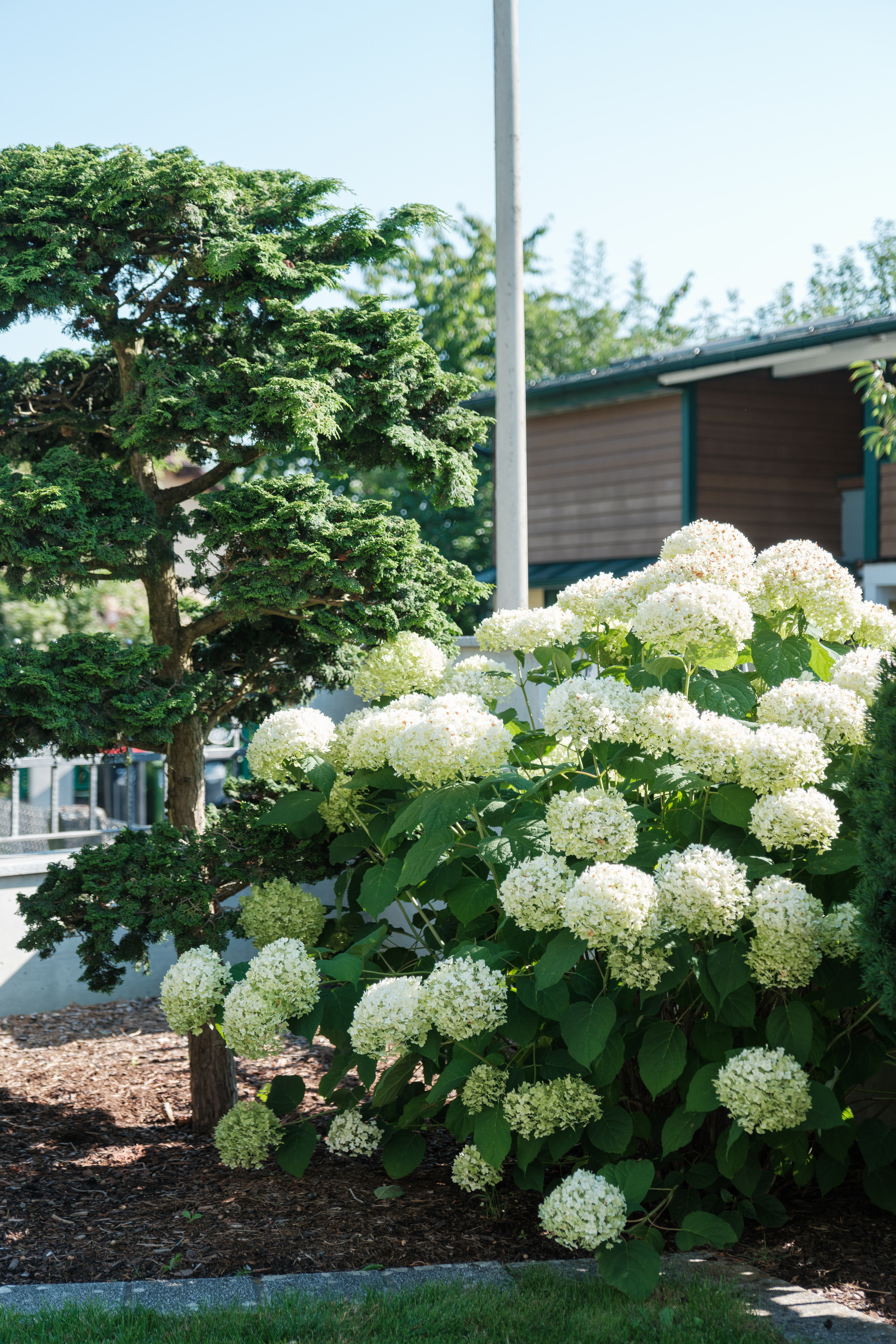 Ganz nach ihren Vorstellungen entstand ein Garten, in dem geradlinige Formen auf die zeitlose Schönheit weißer Rosen und Hortensien treffen. Exakt geschnittene Formgehölze, klare Linien und filigrane Blüten sorgen für ein harmonisches Gesamtbild, in dem Natur und Gestaltung in vollkommener Harmonie verschmelzen. Steinfiguren setzen dezente Akzente und verleihen dem Garten eine beinahe meditative Ausstrahlung – ein Ort zum Entspannen, Genießen und Wohlfühlen.