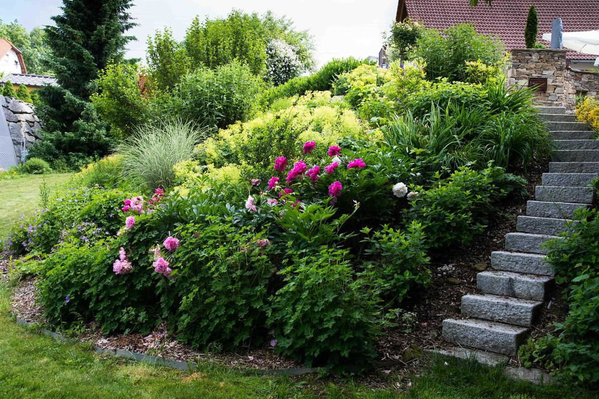 Wir haben 1998 das Haus mit dem rund 1.700m² großen Grundstück in Hanglage gekauft. Die Vorbesitzer haben den Garten aus ihrer Sicht ‚pflegeleicht‘ terrassieren und bepflanzen lassen: Er war gekennzeichnet durch eine Umrandung mit frühlingsblühenden Sträuchern, Koniferen und Bodendeckern. Eine großflächig angelegte Böschung war im gleichen Stil bepflanzt und somit eigentlich für nichts nutzbar. Obwohl das Grundstück – im Vergleich zum eher klein gehaltenen Haus und der reduzierten Terrasse – sehr groß war, bot es keinen Platz für Stauden- oder Gemüsebeete, Sitzplätze oder andere Gartenräume.